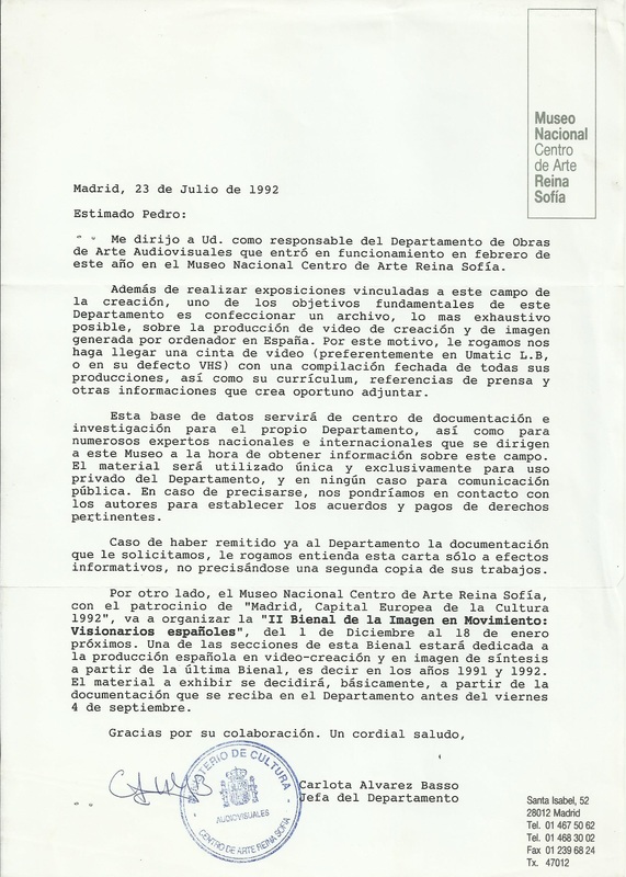 Solicita compilación de las obras en vídeo para añadirla a la base de datos del centro. A su vez, se hará una selección para la "II Bienal de la Imagen en Movimiento"