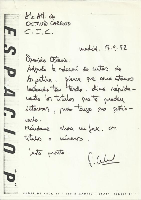 [Carta], 1992 sept. 17, Madrid, a Octavio Cardoso Ver todo items con este valor.